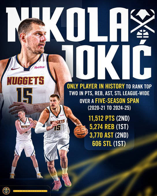 在2020-21赛季至2024-25赛季这五年间,约基奇总得分11512分(联盟第二),篮板5274(联盟第一),助攻3770(联盟第二),抢断606(联盟第一)。他是历史上唯一一位能在五年间总得分、篮板、助攻、抢断同时位居联盟前二的球员。
